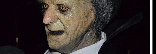 Added in 2013, The Organ Miester Zombiette from Scarefactory was added to the second floor immediately before exiting to the balcony. He plays some chilling tunes out of his trusty organ made out of skulls, bones, and other body parts. |