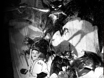 Shown right, a unique advertisement published in the March 24, 1962 issue of Amusement Business Magazine featuring Bill Tracy of Outdoor Dimensional Display Co., Inc., standing with some of his famous Bats as seen on the facade of Trimper's Haunted House. |