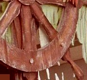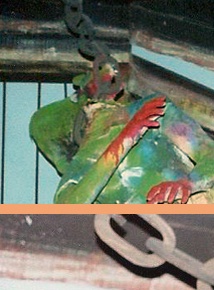 One of the more unusual and ambiguous stunts in Ghost Ship was the headless Pirate who was apparently caught in the chain of the ship’s anchor. This character, which was comprised of mostly a torso with arms and a head, was eventually reassembled and used as an additional pirate figure in the Birthday Party stunt in Trimper's Haunted House, also originally from Ghost Ship. The back drop used in this stunt can be seen today on the second story of Trimper’s Haunted House where the Crab originally resided, currently occupied by BOLT. |