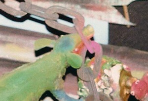 | The rat prop that can be seen in this photo was incorporated into the Mad Scientist stunt when it was moved to Trimper’s Haunted House. Today, the Rat is part of the Brandon Seidl collection. Also from Ghost Ship was Bill Tracy’s demented Birthday Party stunt. Although no pictures exist of the stunt in Ghost Ship, it still remains in Trimper’s Haunted House as one of Tracy’s finest works. You can see in the photos below that the original Ghost Ship character’s torso on the left is in fact the same left-most character that was at one point a part of the Birthday Party. |