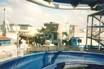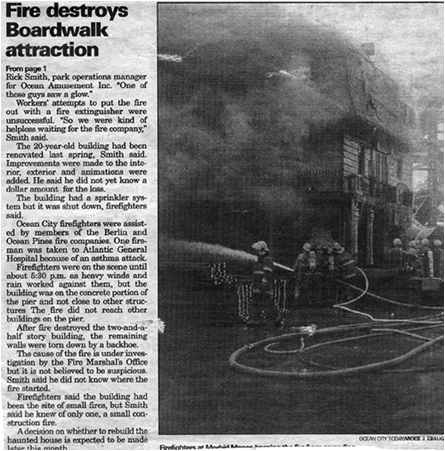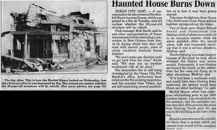 | ![]() Home > Features > Morbid Manor ![]() ![]() Morbid Manor ad as seen on the side of the pier building in 1976. Special thanks to Gerald U. A New Experience In HorrorWhen visitors of Ocean City’s famous boardwalk think of memorable icons from the past, the Morbid Manor undoubtedly comes to mind. Debuting in 1975 for its first season, The “Manor” was a two-and-a-half story walk thru attraction that was known for its live actors, demonizing appearance, and sinister props and effects. Although not a Trimper attraction, it was a one-of-a-kind attraction that stood out from its competitors thanks to its realistic façade and exterior gardens. It towered over the pier and could be recognized from virtually any distance on the boardwalk. It was not simply another carnival attraction, but instead it looked as if an actual abandoned house was uprooted and placed on the pier. It was a rather supernatural experience and scared hundreds of thousands of brave patrons during its tenure on the boardwalk. ![]() 1977 - Special thanks to Gerald U. ![]() 1970s ![]() Mid 1980s - "Year of the Vampire" can be seen on the facade. ![]() 1983. Special thanks to Gerald U. Photos from the Tribune Sun Archives![]() 1977 ![]() 1978 ![]() 1982 ![]() 1988 ![]() 1992 ![]() A full-page ad for Jolly Roger Amusement Park from the summer 1987 issue of Ocean City Resort Guide that includes an illustration of Morbid Manor which has a title of "Vampire of the Year." ![]() 1990s ![]() 1990s ![]() 1990s A Living NightmareIn early November of 1995, a real-life horror show transpired on the pier as Morbid Manor burned to the ground. Fire crews from all over fought the fire but were unable to salvage the famous attraction. Ironically, the ride had just undergone a large renovation the year before and both the interior and exterior were completely revamped. Although the building had a complete sprinkler system, it was shut down for the winter to prevent the pipes from freezing. ![]() November 1995 ![]() Photo pulled from an article published in Ocean City Today - November 10, 1995. ![]() Photo pulled from an article published in Ocean City Today - November 10, 1995. ![]() Photo pulled from an article published in Ocean City Today - November 10, 1995. ![]() Article published in Ocean City Today - November 10, 1995. ![]() Article published in Ocean City Dispatch - November 10, 1995. The Legend LivesAfter the Manor was destroyed by fire, an effort was made to keep the dark ride tradition alive on the pier by adding a portable dark ride called “Ghost” in the late 1990s. “Ghost” was a Barbisan dark ride from Italy that included several animated stunts and a façade that resembled a castle. After several years of being in operation, “Ghost” was renamed “Ghost Pirates” and artists added pirate imagery to the façade before it was completely removed in 2006. The next season, a Zachinni portable dark ride was added, this time called “Morbid Manor II”. The ride featured mostly metal sculptures for effects, and included very few animatronics. In 2010, the ride was overhauled with a 3-D façade, new props were added, and the ride was retitled “Morbid Manor 3-D” in an effort to attract a broader audience. ![]() "Ghost" dark ride that took the place of the original Morbid Manor. ![]() Morbid Manor II as it looked around 2008. ![]() Morbid Manor 3-D as it looked after the makeover in 2010.