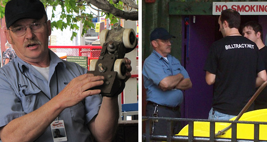 According to Perry Duncan, head maintenance worker for the Shack, Tracy worked long hours installing, painting, and tweaking the ride before it opened for the 1970 operating season. He remembers how Tracy would enter the ride to work and reemerge hours later with his clothes covered in paint. “He stood right here where you are standing,” said Duncan as we were looking at the attraction’s towering façade. He also remembers how Tracy would leave the park to get more paint at the local store only to come back a few hours later after getting a little sidetracked at some of the local establishments. Duncan’s primary focus is maintaining the Shack’s Hush-Puppy ride system which contains six cars in the fleet. He also assists with maintaining the ride’s stunts, most of which he helped originally install.