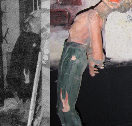 Not earth-shattering, but kind of neat. We have already established in the April 2, 2009 update that this catalog photo is the actual stunt as seen in the Torture Chamber in Trimper's Haunted House. But, until last night, I failed to realize that yet another member of the Torture Chamber is featured in this photo as well! Take a close look to the left of the Damsel in Distress, and you'll see a figure with ripped pants, hunched over backwards with no shirt. You guessed it, it's actually the victim being hung upside-down in the Torture Chamber! Close comparisons of features prove this, and I have done a quick comparison to show you. Pretty neat, huh? To the right of the photo in the background, there appears to be a diorama getting ready to be shipped. Could this be the Mermaid?