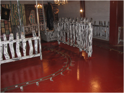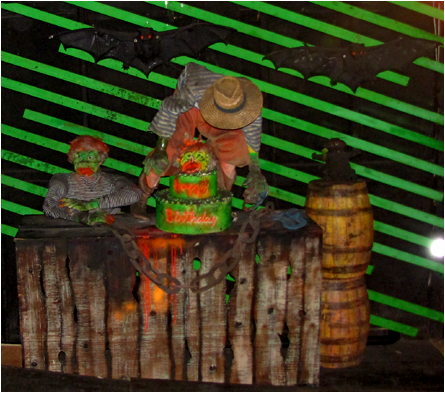 The counter from the Mad Scientist did not go to waste. It had a very cool look to it, so we decided to incorporate it in to the Birthday Party scene. Due to the fact that the Birthday Party only has two characters now, the large table that was part of the stunt was not only too big, but it was very low making it hard for riders to see the props, and it was blocking some of the walking space next to the track. So, we opted to put the original Birthday Party table in to storage and use Tracy’s Mad Scientist counter to elevate the display higher. Further, the old chains from Ghost Ship and barrels from Phantasmagoria were also added to bring the stunt back to life. It was a win-win situation as we were able to keep Tracy’s Mad Scientist stunt alive in some sense, but also add some more original styling and color to one of Tracy’s most memorable and freakishly grotesque stunts.