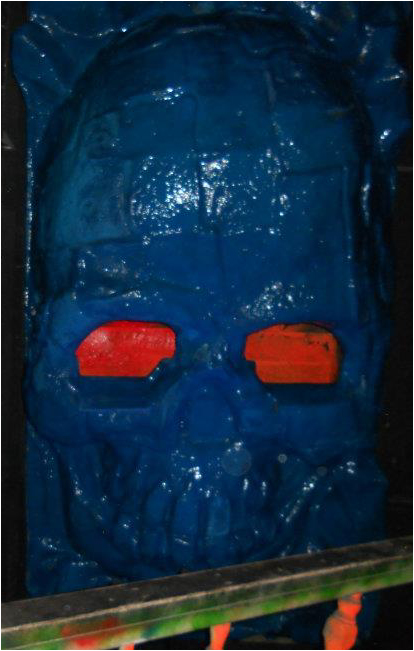 For anyone curious, the blue color that was painted on the giant skull actually appears white under a black light. So, riders will see a giant white skull as they pass. This year, crews also repainted the skulls on the Skull Banister in the first room with this paint so they glow white now, with orange eyes. Pictures to come soon.