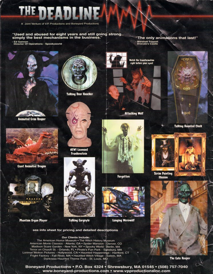Check out an awesome advertisement from The Deadline featuring the famous animated talking door knocker that adorns the wall above the entrance door. The Deadline was a company set up as a joint venture between V.P. Productions and Boneyard Productions. Although, whenever service or parts are needed for the effect, the management calls V.P. Productions directly. Special thanks to Randy Skalos, caretaker of Waldameer’s Whacky Shack for sharing this piece from his collector’s vault!