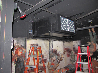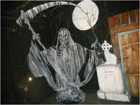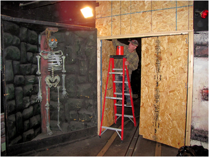 Next up is the location for Tracy’s Pop-up Coffin which is across from the Knit Wit and Witch, right before heading in to the Graveyard. The skeleton in this stunt actually sits up upon activation. It is very creepy. This location allowed us to tap in to the air line for the Old Mill stunt which is on the other side of the wall. We plan to make it activate at the same time as the Witch so it is certain to scare you regardless of where you are looking. A double black light fixture was mounted on the wall behind this stunt to bring it alive! Click here to see how this stunt looked in the Graveyard of Phantasmagoria. Stay tuned for future updates.