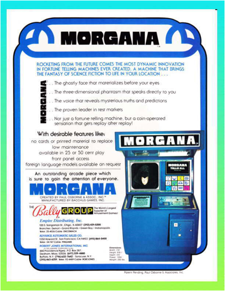 As an aside, this machine was very popular in the early 1970s. 'Morgana' was a primary feature in Disney's Contemporary Resort in the Fiesta Fun Center in the early 1970s and was commonly mistaken for a Disney-made machine because of the technology used to project a face on to the bust, similar to the effects of Disney's Haunted Mansion. It fit in perfectly with Disney's innovative and highly-technological atmosphere.