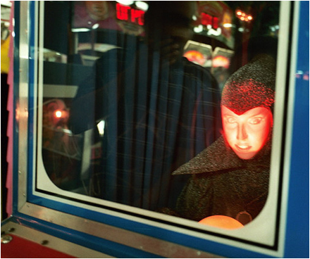 New evidence has surfaced regarding the origin of the Alien Bust prop at the ride's ending which was installed sometime in the late 90s. A fan named Victoria, who has been following the ride's transformation in great detail over the past two decades, recently brought to my attention that the Alien Bust closely resembled 'Morgana,' a vintage fortune teller machine by Bacchus Games, Inc. that was commonly found in arcades around the country and at beachfront amusement parks during the 1970s and 1980s. Based on research, 'Morgana,' was a faceless mannequin behind a window in a large blue cabinet. After inserting money and typing in your date of birth, players pressed a button that activated a hidden projector. Suddenly Morgana's face appeared, and her somewhat frightening lifelike image moved as she spoke and told the customer's fortune. After doing some searching, I was able to find a photo of a Morgana machine, and indeed, it is the same bust! The same sparkly material for the outfit, same pendant, and same featureless face!
