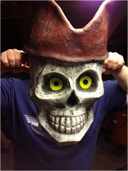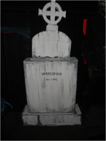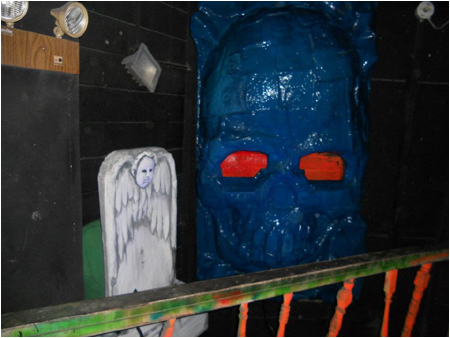The old foam skull and hands from the Mad Scientist area have been mounted to the wall in the graveyard!