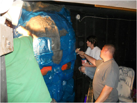 Crews add a fresh coat of blue paint to the Skull from the Skull Waterfall at Phantasmagoria!
