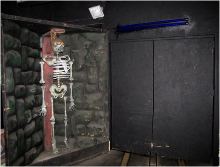 The Hanging Skeleton stunt, being eight feet tall and about six feet wide, was undoubtedly one of the harder pieces to place, but we found the perfect spot. In 2006, Tracy’s Mad Scientist stunt was removed from this location and replaced with a large, modern-day latex skull. The original counter of the Mad Scientist was retained and used as part of the new stunt. This location seemed to be the most practical as the Hanging Skeleton would carry the theme of the Torture Chamber to the other side of the corridor. A black light was placed in the bottom of the cabinet shining upward, and a double fixture was mounted above the newly-installed set of bang doors just after the Torture Chamber.