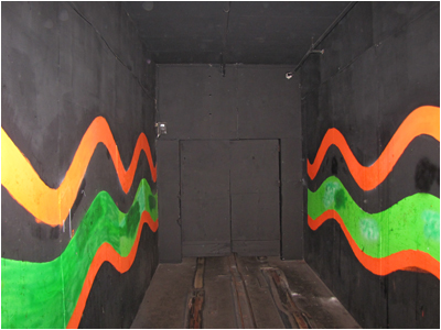 The front wall in the Wave Room that was showing a lot of screws and washers from when it was reattached to the wall after being vandalized.