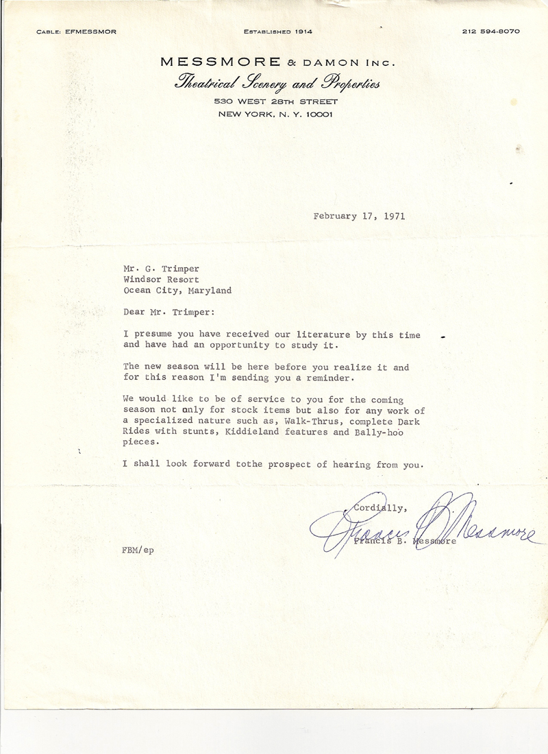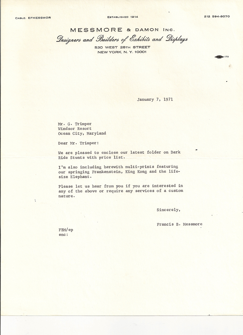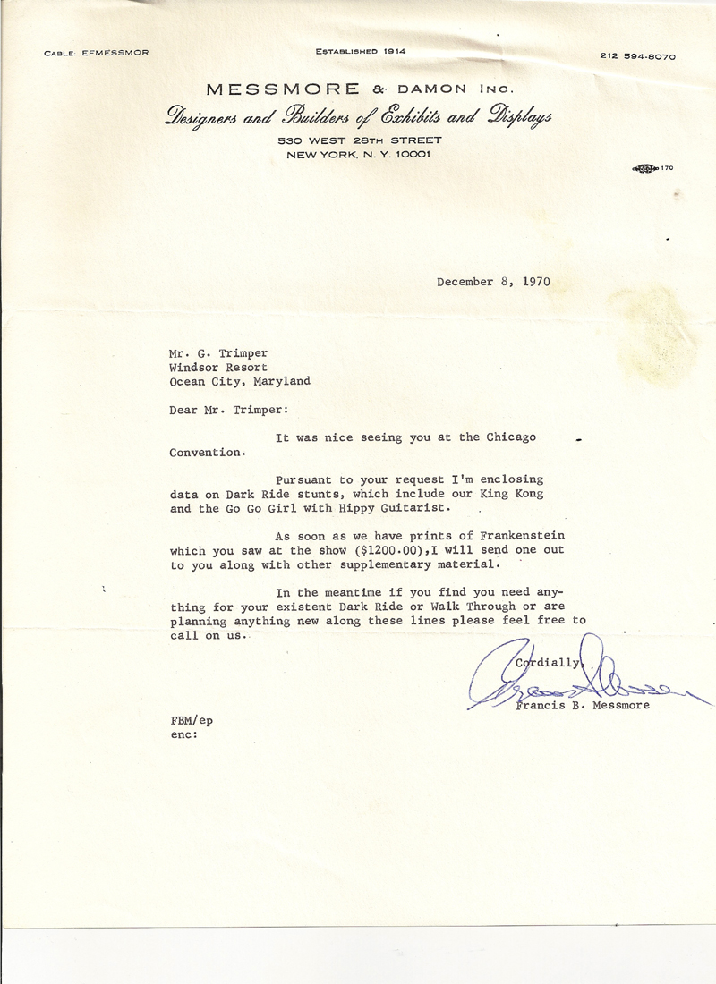 I have recently uncovered three letters to Granville Trimper from Francis Messmore of Messmore & Damon, Inc. spanning from December of 1970 through February of 1971. In the letters, Messmore is following up with Granville about the "Springing Frankenstein" that he inquired about at that year's IAAPA show in Chicago. I don't believe the signatures is authentic, because it changes pretty dramatically in each document. It's still neat to see some behind-the-scenes business taking place for a ride that we all care so much about. Check them out: 1 | 2 | 3