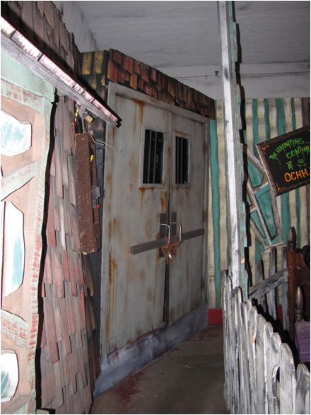 In Haunted House news, the biggest addition thus far has been to the lobby. For the first time since 2005, a new effect has been added to the far right corner of the lobby as guests exit the ride. It is an effect called "Breakthru" from Pale Night Productions. It is a high-impact video effect where zombies appear to flood toward a set of chained doors as air pistons physically move the doors. To make room for the effect, a piece of Tracy's original wall panel was removed and relocated to the second story. The crew did an outstanding job painting the added shingles and scenery around the effect to make it blend in with Tracy's original panels. A timer will shortly be installed to allow the effect to trigger every five minutes. Check out a full gallery of this new addition.