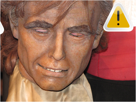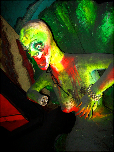 I always try to remain optimistic about the Ghost Ship-era stunts in the ride, but they always seem to be the ones to get the shaft and forgotten about, certainly not on purpose, but perhaps because of timing or circumstance. Looking back at all of the Ghost Ship stunts that have already left us -- Crab, Seasick Pirate, Mad Scientist, Attic Stairs, Wine Cellar, and Mine Shaft -- it makes me a bit concerned about the classic Ghost Ship pieces that remain, such as two of my personal favorites, the Birthday Party and the Mermaid. Mike B's most recent picture of the Mermaid taken this year really opened my eyes to the fact that these Tracy molds are practically rotting away and are endangered. I suggest everyone take lots of photos of the Mermaid the next time you visit, because in its current location, all it will take is for one patron to throw a punch to her head, and it will be all over.