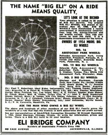 Granville Trimper's Big Eli Ferris Wheel will surely be missed this year as it is the first year it will be excluded from the park since it was purchased over a half-century ago due to the ride's retirement. It was one of the first rides in the outdoor area of the park, and certainly one of the most memorable. For many years, it served as the only Ferris Wheel in the Trimper ride lineup. Below is a clipping from a 1954 issue of Amusement Business that advertises the Eli Wheel as being not only an attractive piece to have in your park, but also the most profitable of its time. In the list of owners, Granville D. and Pearl M. Trimper are proudly named.