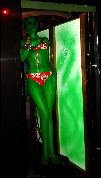The ride has been running smooth so far this summer with very few incidences. That being said, I regret to share that the "Green Lady" from Phantasmagoria was pulled onto the track by a vandal a few weeks ago, then was run over by the following car. The stunt suffered damage, particularly to the base which includes the mechanism that makes her arm move up and down. She has since been moved from the Vampiress room to near the Electric Chair out of harm's way. I hope to get down there at some point this fall to check out the damage and perhaps fix it.
