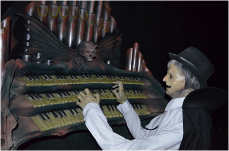 Happy Memorial Day! I would like to introduce the newest member of the Haunted House family, "The Organ Miester Zombiette." Brand new for this year, this creepy dude plays some chilling tunes out of his trusty organ made up of skulls and other body parts. He comes direct from the Scarefactory and was added upstairs in the place of the Buzzard from Phantasmagoria. Check out the original catalog listing here. His head turns from side to side, and there is an audio track that plays along with him. The Buzzard cabinet was moved to the Electric Chair area to make room, and the Mermaid was moved to the Cuckoo Clock area. It's hard to keep up with the ongoing changes! Check out a full gallery of the new stunt. More updates to come this week.
